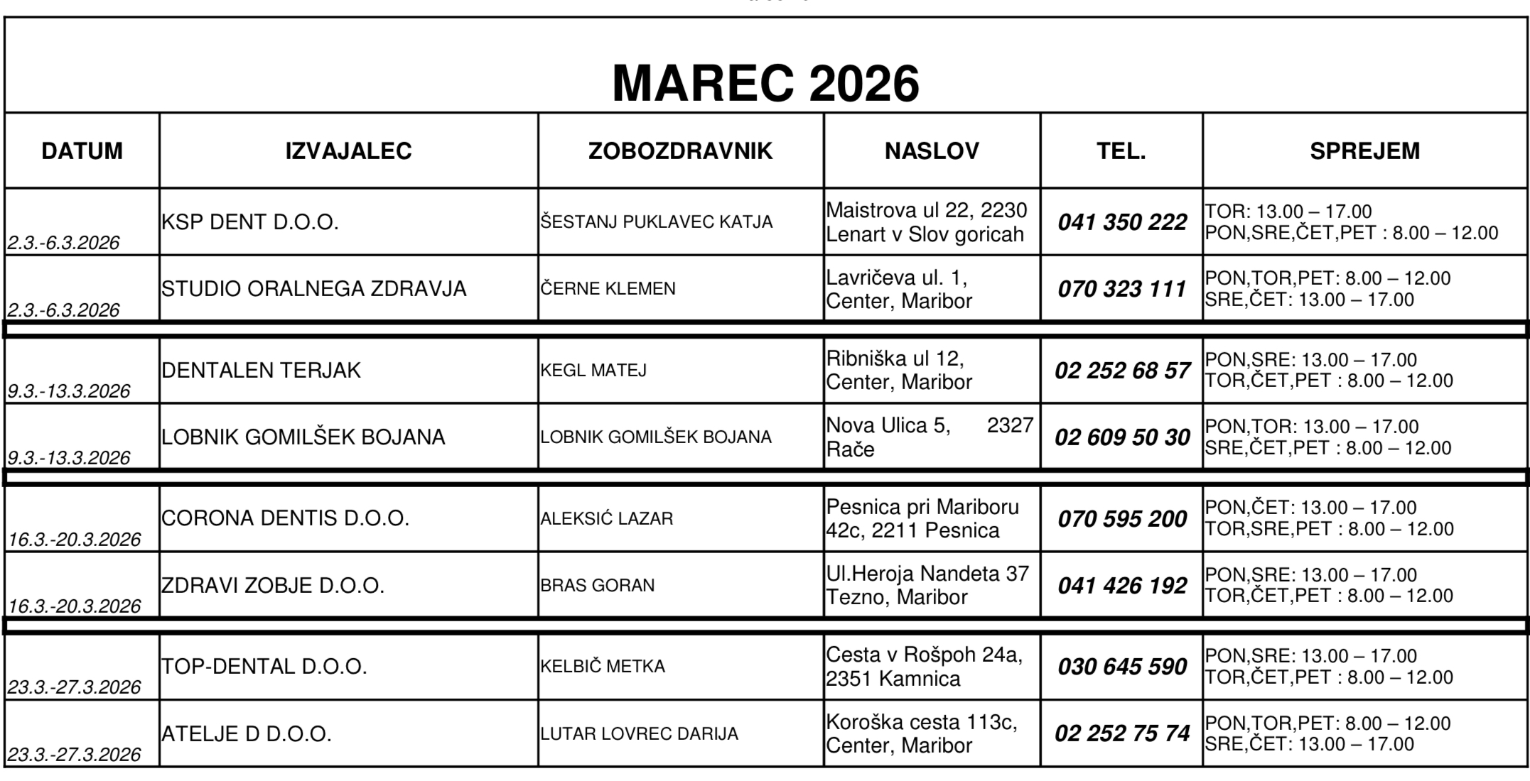 Vsak delovnik: PON, TOR: 12:00 – 16:00 | SRE, ČET, PET: 07:30 – 11:30
